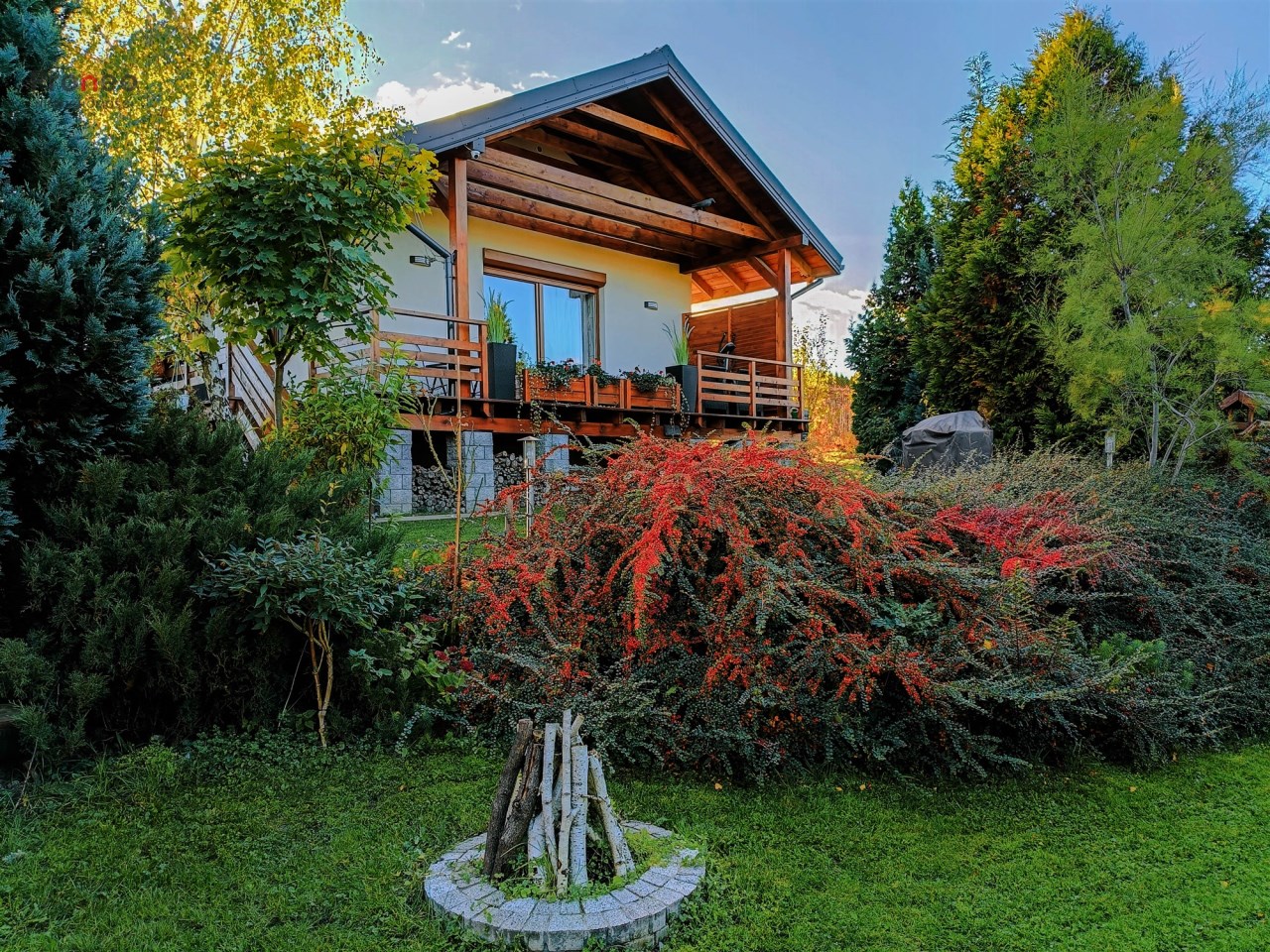 Zastosowane rozwiązania – zdalnie sterowana klimatyzacja dwufunkcyjna umożliwia utrzymanie odpowiedniej temperatury w domu, a zainstalowany monitoring pozwala kontrolować bieżącą sytuację na posesji. Ponadto, do budowy domu użyto wysokiej jakości materiałów co przekłada się na solidną konstrukcję, a to umożliwia zarówno sezonowe jak i całoroczne użytkowanie. Dodatkowe elementy wyposażenia obejmują wędzarnie z klinkieru, drewutnię, wiatę jednostanowiskową na samochód oraz wyciągarkę do łodzi.