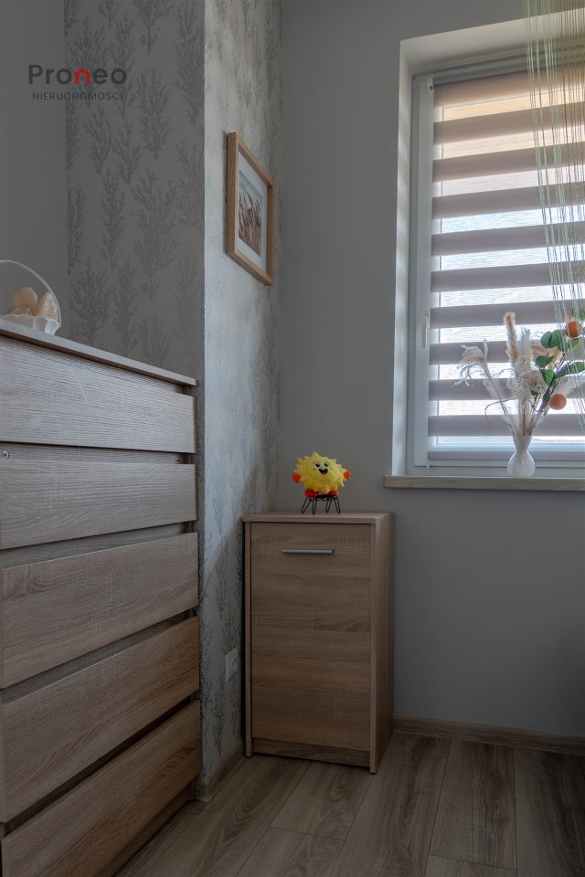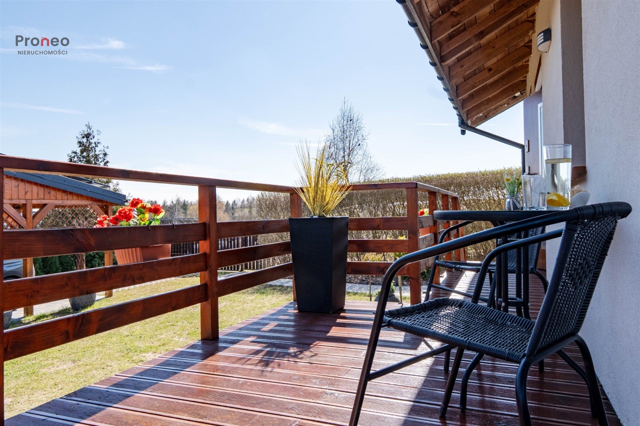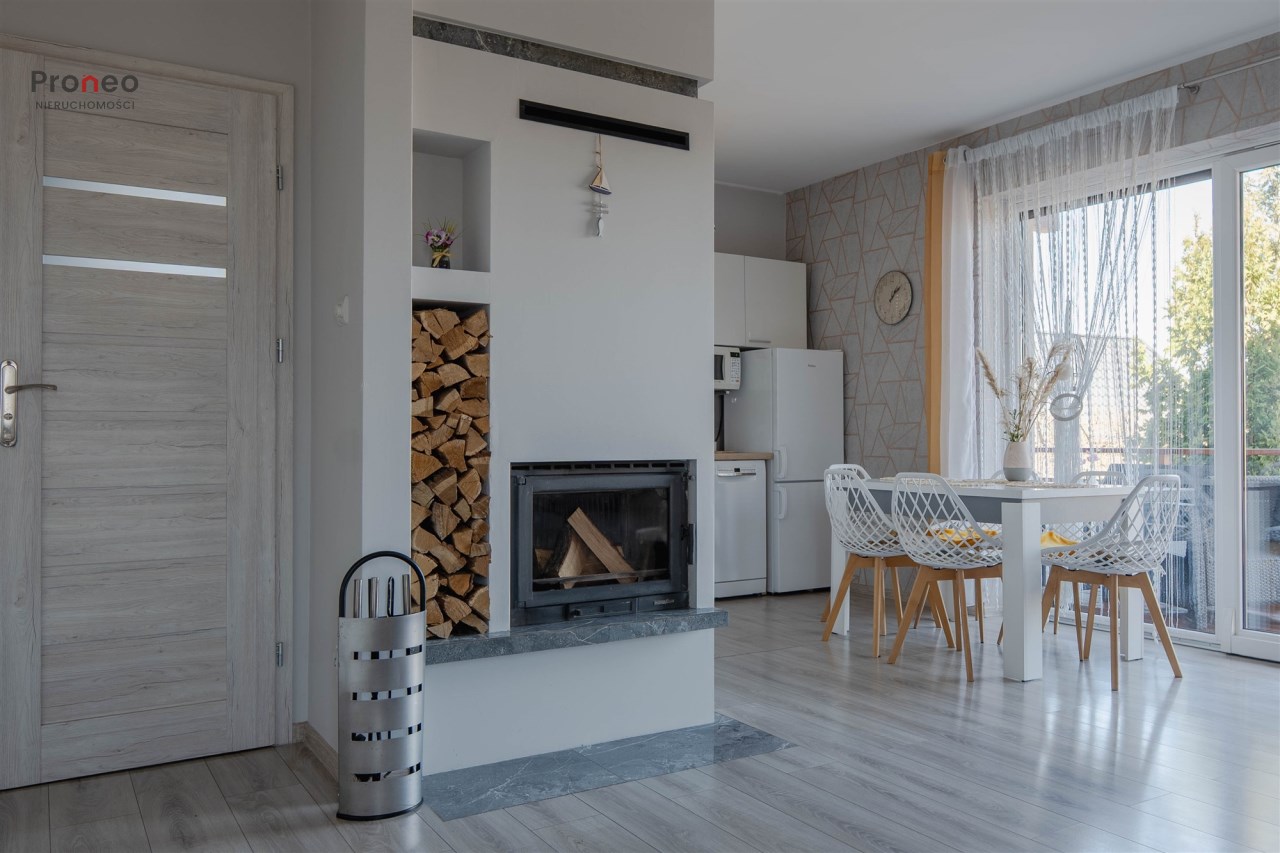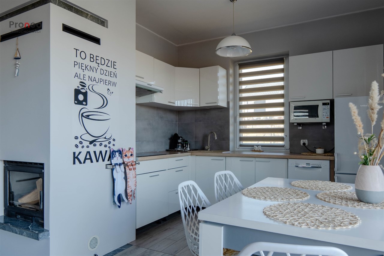 Dom powstał w 2020 roku wybudowany z pustaka Porotherm, ocieplony styropianem (15cm) i pokryty tynkiem mineralnym. Dach pokryty jest blachodachówką, stolarka okienna PCV z roletami zewnętrznymi sterowanymi zdalnie. Wnętrze jest w pełni funkcjonalne i gustownie wykończone z użyciem materiałów wysokiej jakości. Głównym źródłem ogrzewania jest kominek usytuowany w centralnym punkcie domu, co dodaje wnętrzu uroku i tworzy odpowiedni klimat do odpoczynku i relaksu w jesienne i zimowe wieczory. Kominek wyposażony jest w system dystrybucji gorącego powietrza (DGP) co pozwala szybko i sprawnie ogrzać cały dom. Dodatkowo, nieruchomość wyposażona jest w klimatyzację dwufunkcyjną obsługiwaną przez wifi, co pozwala utrzymać optymalną temperaturę zarówno latem jak i zimą. Instalacja fotowoltaiczna o mocy 3KW pokrywa zapotrzebowanie nieruchomości na energię elektryczną.