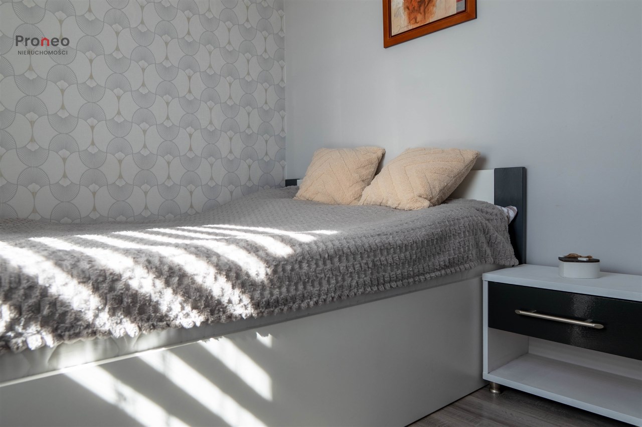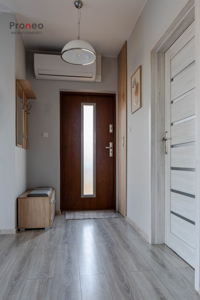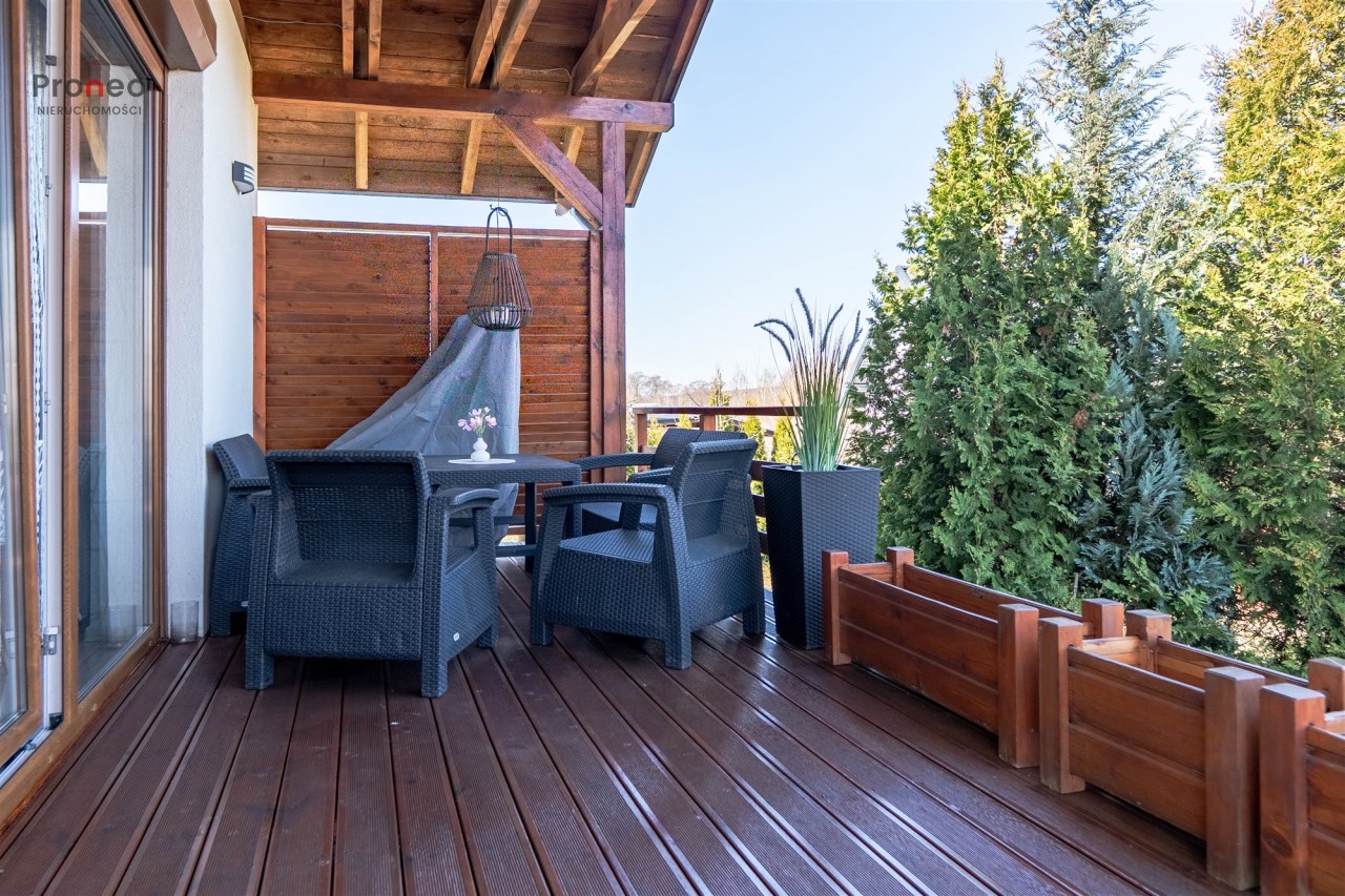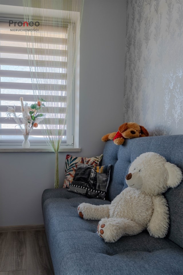 Dom powstał w 2020 roku wybudowany z pustaka Porotherm, ocieplony styropianem (15cm) i pokryty tynkiem mineralnym. Dach pokryty jest blachodachówką, stolarka okienna PCV z roletami zewnętrznymi sterowanymi zdalnie. Wnętrze jest w pełni funkcjonalne i gustownie wykończone z użyciem materiałów wysokiej jakości. Głównym źródłem ogrzewania jest kominek usytuowany w centralnym punkcie domu, co dodaje wnętrzu uroku i tworzy odpowiedni klimat do odpoczynku i relaksu w jesienne i zimowe wieczory. Kominek wyposażony jest w system dystrybucji gorącego powietrza (DGP) co pozwala szybko i sprawnie ogrzać cały dom. Dodatkowo, nieruchomość wyposażona jest w klimatyzację dwufunkcyjną obsługiwaną przez wifi, co pozwala utrzymać optymalną temperaturę zarówno latem jak i zimą. Instalacja fotowoltaiczna o mocy 3KW pokrywa zapotrzebowanie nieruchomości na energię elektryczną.